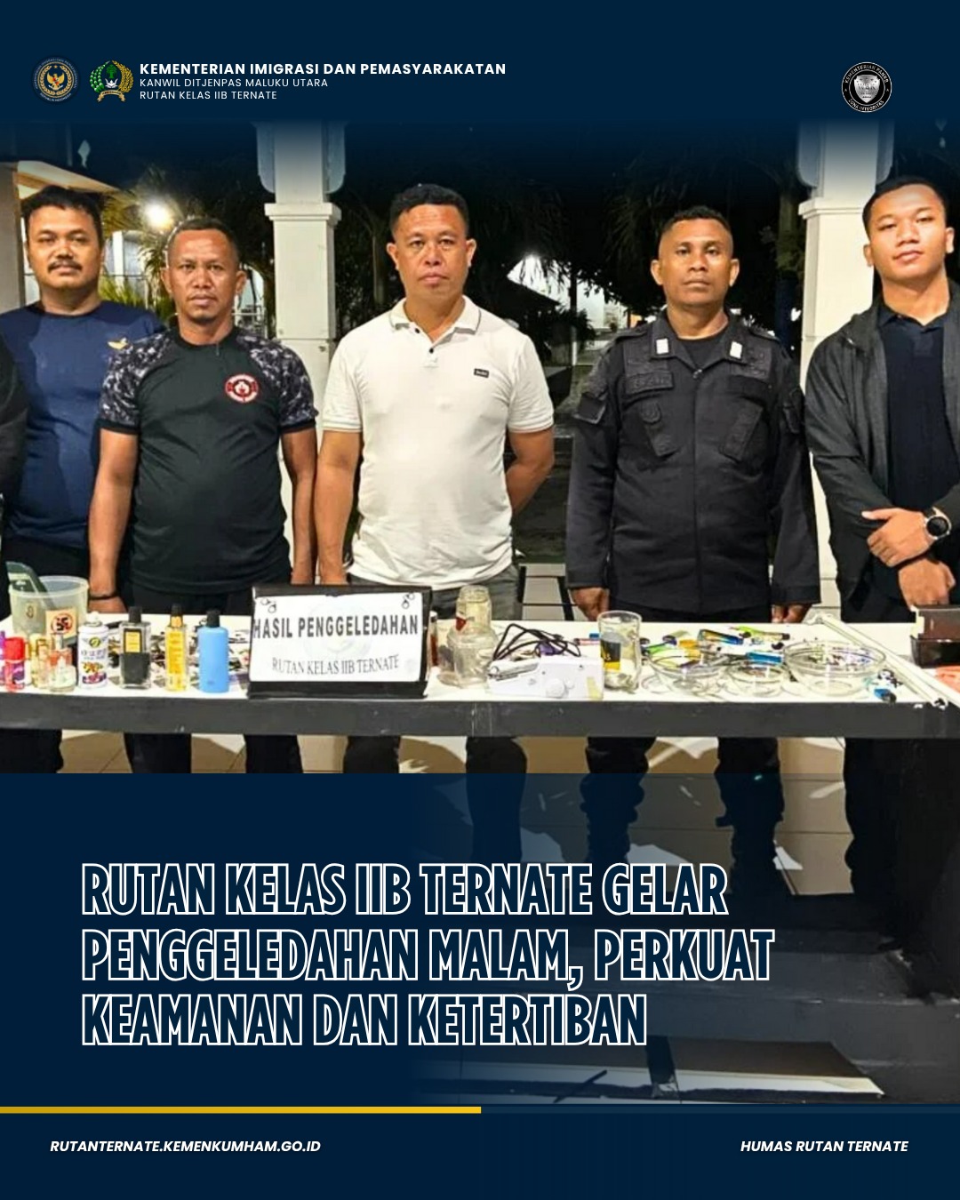 Ternate – Dalam rangka menjaga keamanan dan ketertiban di lingkungan Rumah Tahanan Negara (Rutan) Kelas IIB Ternate, jajaran Kesatuan Pengamanan Rutan (KPR) melaksanakan kegiatan penggeledahan kamar hunian warga binaan pada malam hari, Jumat (24/10/2025).